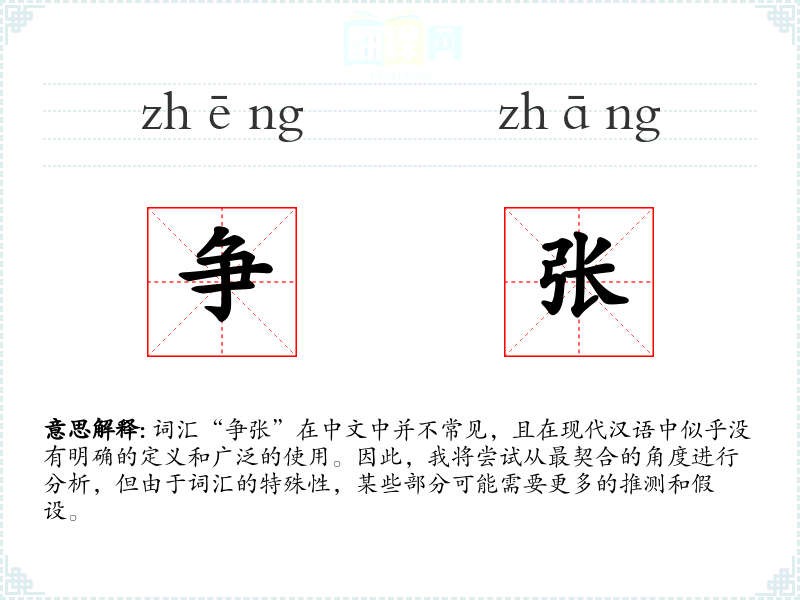 由于“争张”在现代汉语中不常见,对其理解和应用可能需要更多的语言学研究和实际使用情境。在语言学习和表达中,了解和掌握常用词汇更为重要。