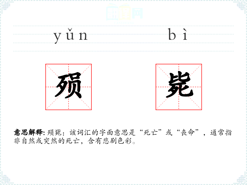 “殒”字古汉语中意为坠落,引申为死亡;“毙”字原意为倒下,也引申为死亡。两者结合,强调了死亡的突然性和非自然性。