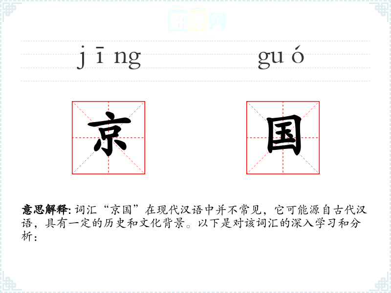 词汇“京国”在现代汉语中并不常见,它可能源自古代汉语,具有一定的历史和文化背景。以下是对该词汇的深入学*和分析: