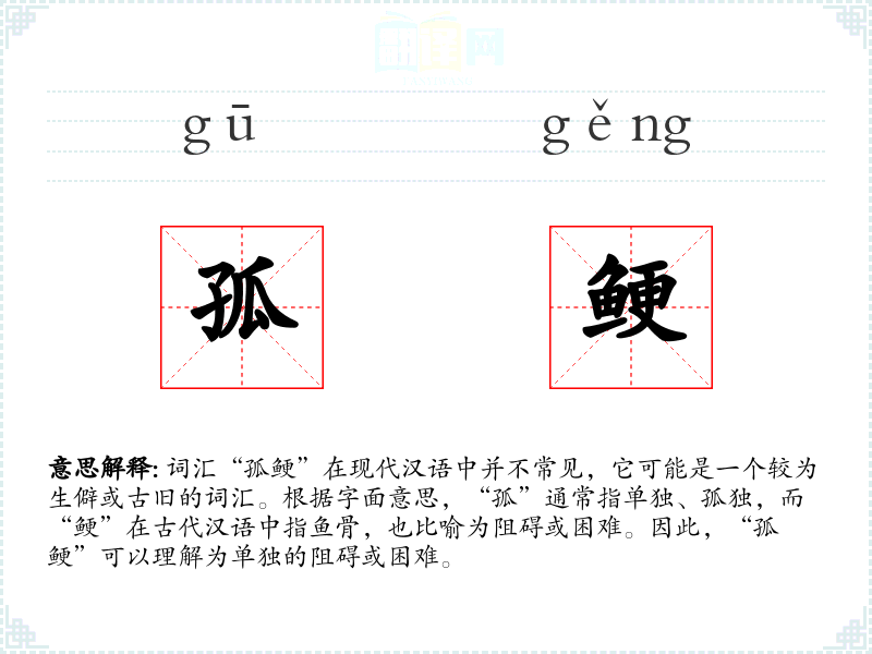 词汇“孤鲠”在现代汉语中并不常见,它可能是一个较为生僻或古旧的词汇。根据字面意思,“孤”通常指单独、孤独,而“鲠”在古代汉语中指鱼骨,也比喻为阻碍或困难。因此,“孤鲠”可以理解为单独的阻碍或困难。