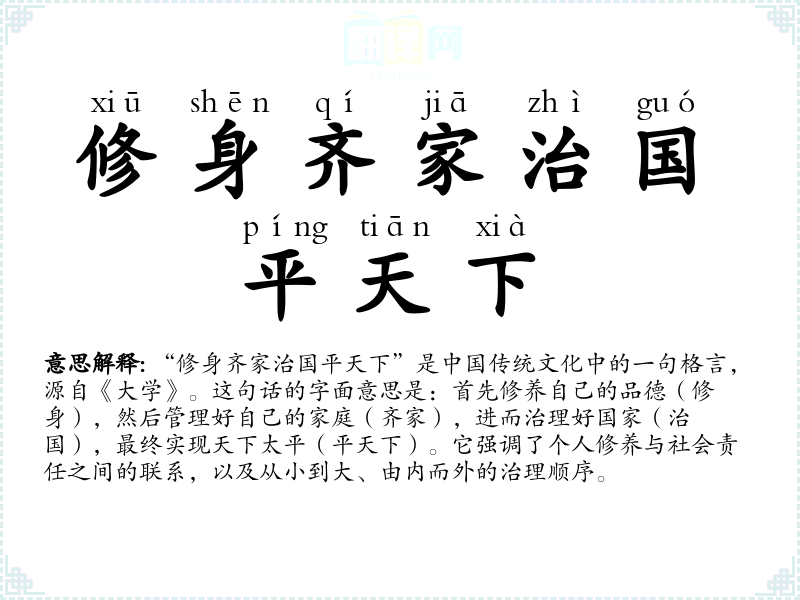 - 在家庭教育中,父母常常引用“修身齐家治国平天下”来教导孩子要有责任感和自我约束力。