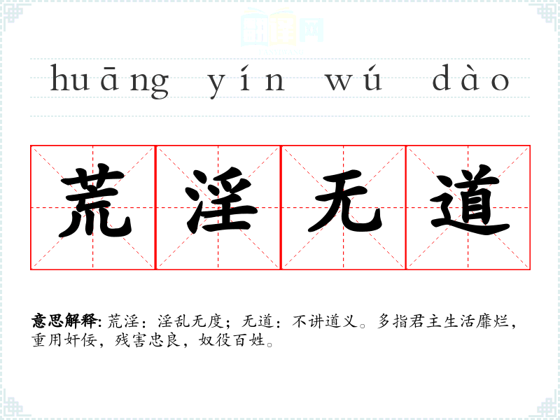 荒淫:淫乱无度;无道:不讲道义。多指君主生活靡烂,重用奸佞,残害忠良,奴役百姓。