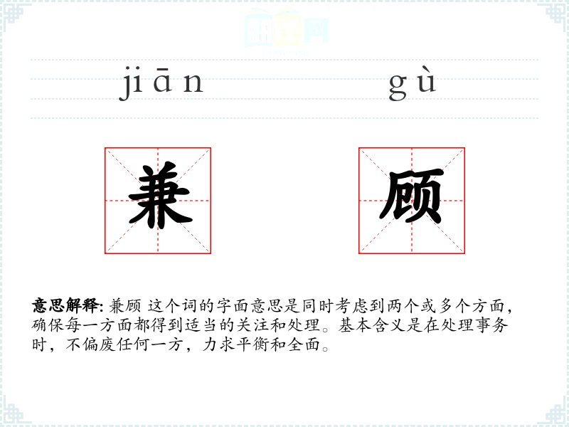 兼顾 这个词的字面意思是同时考虑到两个或多个方面,确保每一方面都得到适当的关注和处理。基本含义是在处理事务时,不偏废任何一方,力求平衡和全面。