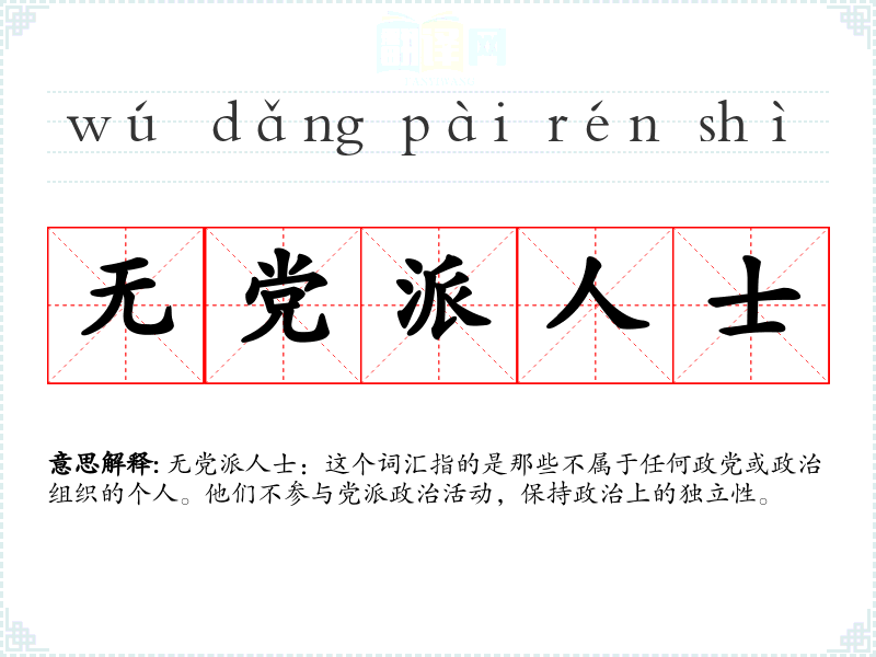 无党派人士:这个词汇指的是那些不属于任何政党或政治组织的个人。他们不参与党派政治活动,保持政治上的独立性。