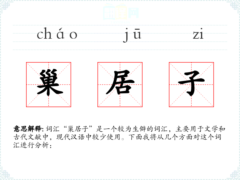 词汇“巢居子”是一个较为生僻的词汇,主要用于文学和古代文献中,现代汉语中较少使用。下面我将从几个方面对这个词汇进行分析: