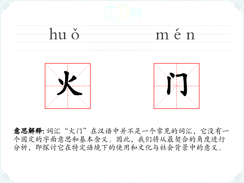 词汇“火门”在汉语中并不是一个常见的词汇,它没有一个固定的字面意思和基本含义。因此,我们将从最契合的角度进行分析,即探讨它在特定语境下的使用和文化与社会背景中的意义。