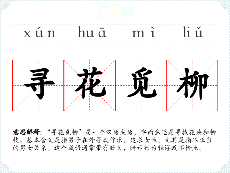 “寻花觅柳”是一个汉语成语,字面意思是寻找花朵和柳枝。基本含义是指男子在外寻欢作乐,追求女性,尤其是指不正当的男女关系。这个成语通常带有贬义,暗示行为轻浮或不检点。