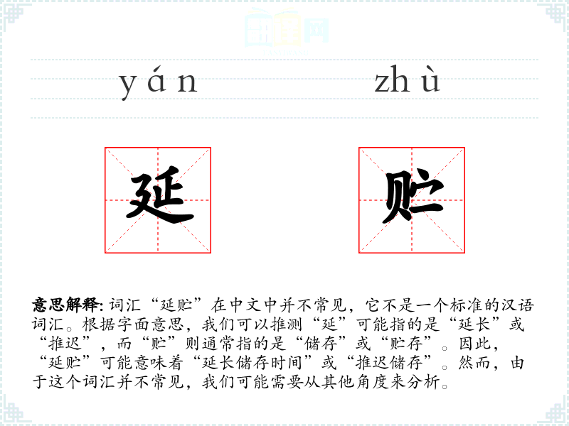 由于“延贮”不是一个标准词汇,我们无法给出一个确切的基本定义。但从字面意思来看,它可能指的是某种形式的延长储存或推迟储存的行为。