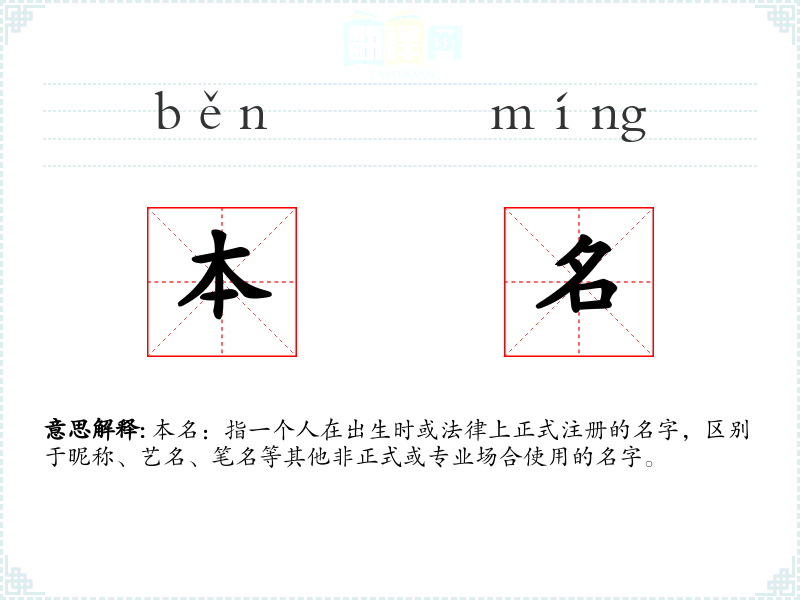 本名:指一个人在出生时或法律上正式注册的名字,区别于昵称、艺名、笔名等其他非正式或专业场合使用的名字。