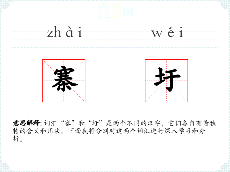 词汇“寨”和“圩”是两个不同的汉字,它们各自有着独特的含义和用法。下面我将分别对这两个词汇进行深入学*和分析。