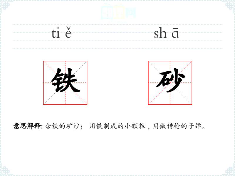 含铁的矿沙; 用铁制成的小颗粒﹐用做猎枪的子弹。