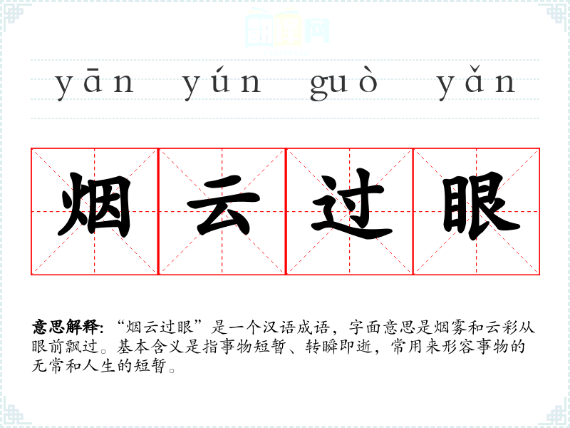 “烟云过眼”是一个汉语成语,字面意思是烟雾和云彩从眼前飘过。基本含义是指事物短暂、转瞬即逝,常用来形容事物的无常和人生的短暂。