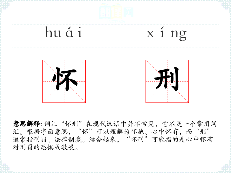 词汇“怀刑”在现代汉语中并不常见,它不是一个常用词汇。根据字面意思,“怀”可以理解为怀抱、心中怀有,而“刑”通常指刑罚、法律制裁。结合起来,“怀刑”可能指的是心中怀有对刑罚的恐惧或敬畏。