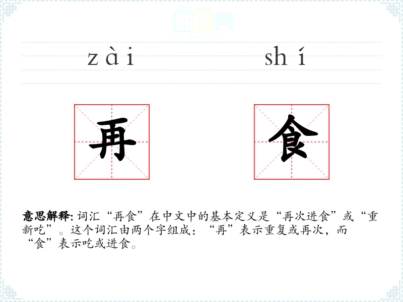 词汇“再食”在中文中的基本定义是“再次进食”或“重新吃”。这个词汇由两个字组成:“再”表示重复或再次,而“食”表示吃或进食。