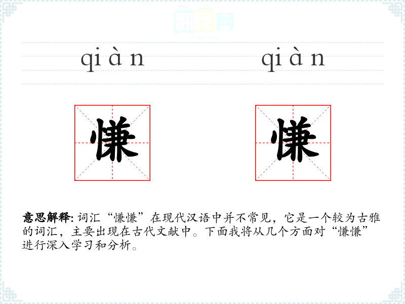 词汇“慊慊”在现代汉语中并不常见,它是一个较为古雅的词汇,主要出现在古代文献中。下面我将从几个方面对“慊慊”进行深入学*和分析。
