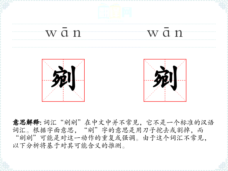 词汇“剜剜”在中文中并不常见,它不是一个标准的汉语词汇。根据字面意思,“剜”字的意思是用刀子挖去或割掉,而“剜剜”可能是对这一动作的重复或强调。由于这个词汇不常见,以下分析将基于对其可能含义的推测。