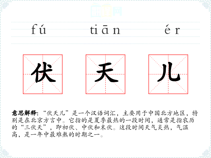 “伏天儿”是一个汉语词汇,主要用于**北方地区,特别是在北京方言中。它指的是夏季最热的一段时间,通常是指农历的“三伏天”,即初伏、中伏和末伏。这段时间天气炎热,气温高,是一年中最难熬的时期之一。