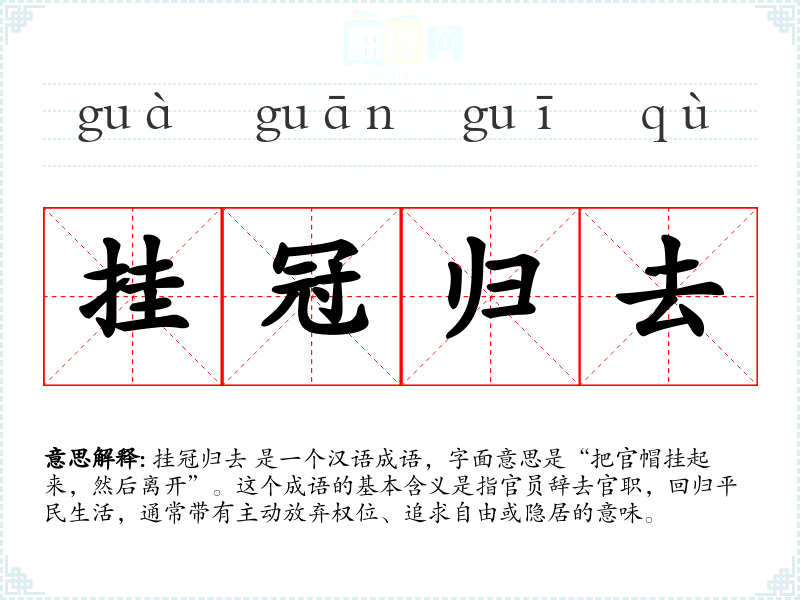 挂冠归去 是一个汉语成语,字面意思是“把官帽挂起来,然后离开”。这个成语的基本含义是指官员辞去官职,回归平民生活,通常带有主动放弃权位、追求自由或隐居的意味。