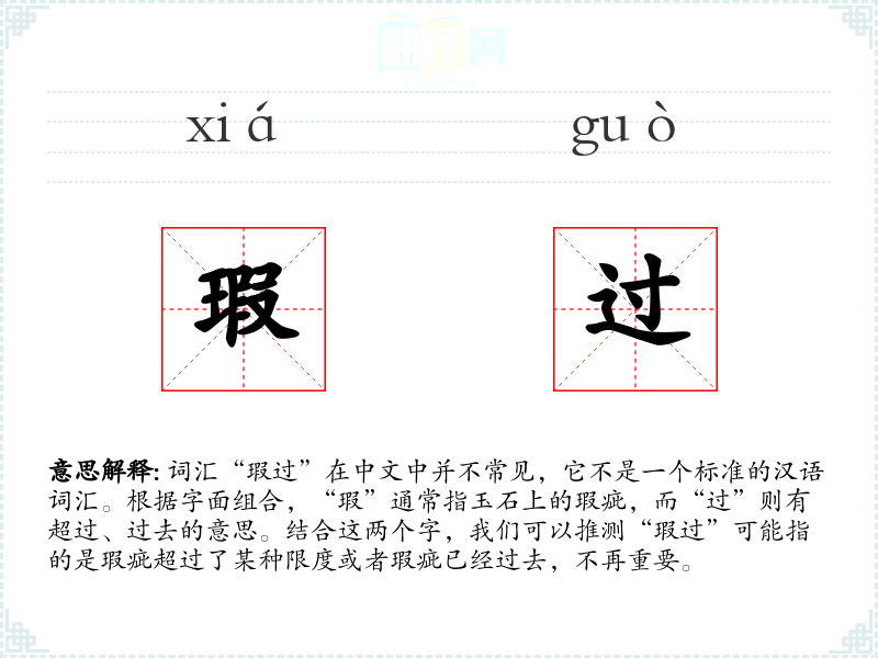 由于“瑕过”不是一个常用词汇,其词源和演变不详。可能是由“瑕”和“过”两个常用字组合而成的新词。