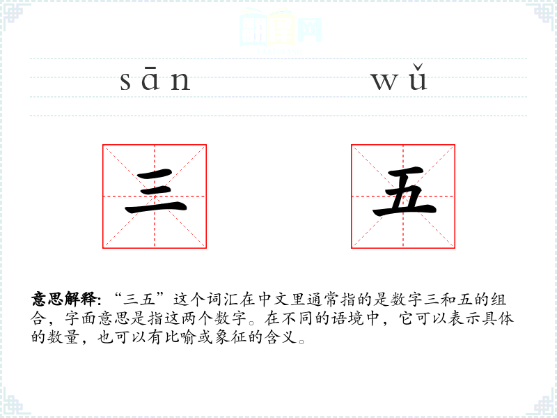 - 文学语境:在文学作品中,“三五”常用来形容数量不多,如“三五成群”表示几个人聚集在一起。