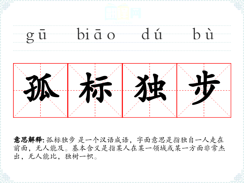 孤标独步 是一个汉语成语,字面意思是指独自一人走在前面,无人能及。基本含义是指某人在某一领域或某一方面非常杰出,无人能比,独树一帜。