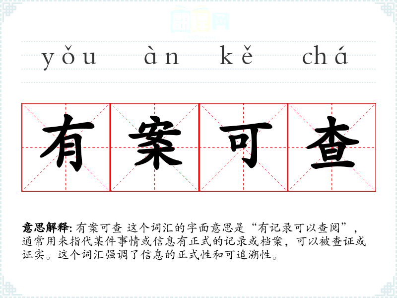 有案可查 这个词汇的字面意思是“有记录可以查阅”,通常用来指代某件事情或信息有正式的记录或档案,可以被查证或证实。这个词汇强调了信息的正式性和可追溯性。