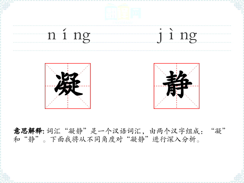 词汇“凝静”是一个汉语词汇,由两个汉字组成:“凝”和“静”。下面我将从不同角度对“凝静”进行深入分析。