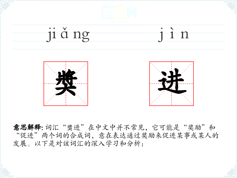 词汇“奬进”在中文中并不常见,它可能是“奖励”和“促进”两个词的合成词,意在表达通过奖励来促进某事或某人的发展。以下是对该词汇的深入学习和分析: