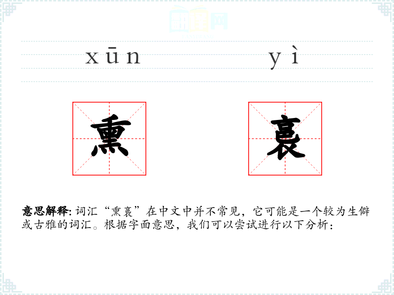 词汇“熏裛”在中文中并不常见,它可能是一个较为生僻或古雅的词汇。根据字面意思,我们可以尝试进行以下分析: