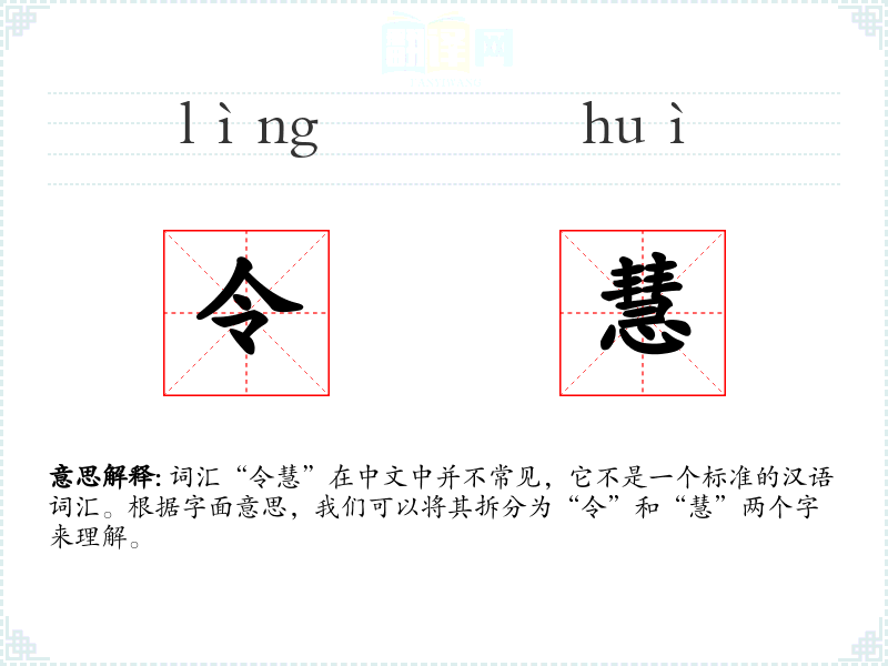 词汇“令慧”在中文中并不常见,它不是一个标准的汉语词汇。根据字面意思,我们可以将其拆分为“令”和“慧”两个字来理解。
