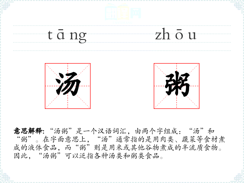 “汤粥”是一个汉语词汇,由两个字组成:“汤”和“粥”。在字面意思上,“汤”通常指的是用肉类、蔬菜等食材煮成的液体食品,而“粥”则是用米或其他谷物煮成的半流质食物。因此,“汤粥”可以泛指各种汤类和粥类食品。