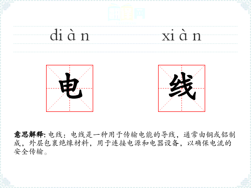 - 词源:电线一词源于“电”和“线”的组合,其中“电”指电能,“线”指导线。