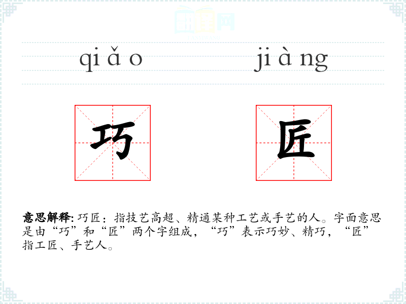 巧匠:指技艺高超、精通某种工艺或手艺的人。字面意思是由“巧”和“匠”两个字组成,“巧”表示巧妙、精巧,“匠”指工匠、手艺人。