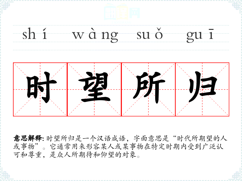 时望所归是一个汉语成语,字面意思是“时代所期望的人或事物”。它通常用来形容某人或某事物在特定时期内受到广泛认可和尊重,是众人所期待和仰望的对象。