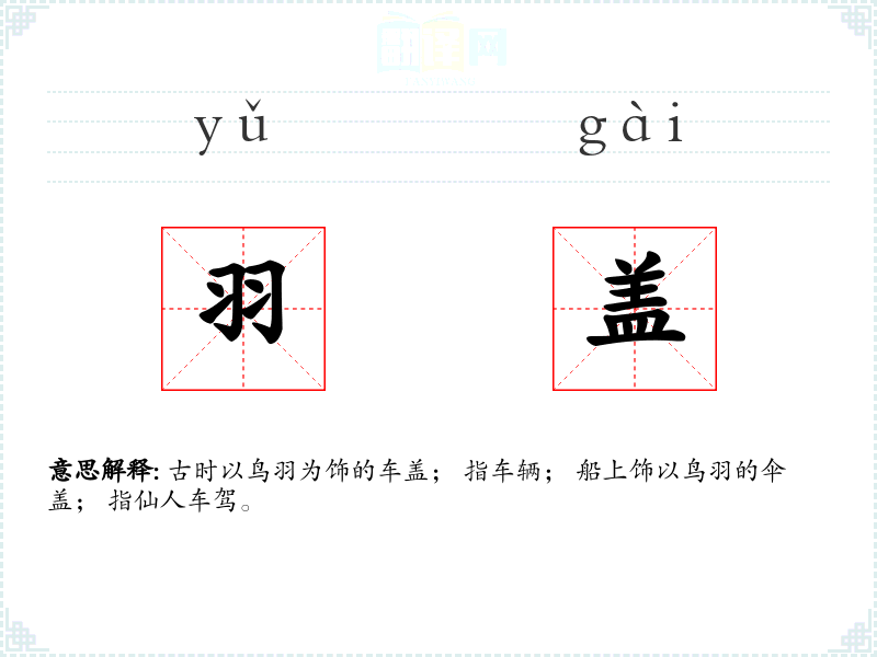 古时以鸟羽为饰的车盖; 指车辆; 船上饰以鸟羽的伞盖; 指仙人车驾。