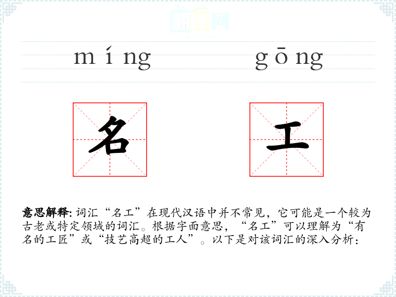 词汇“名工”在现代汉语中并不常见,它可能是一个较为古老或特定领域的词汇。根据字面意思,“名工”可以理解为“有名的工匠”或“技艺高超的工人”。以下是对该词汇的深入分析: