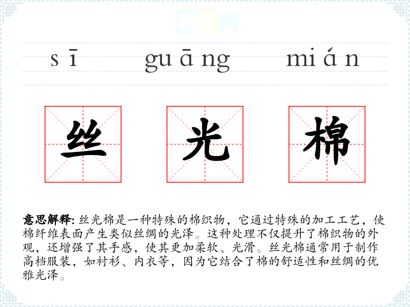 - 同义词:光泽棉、丝滑棉。这些词汇都强调了棉织物的光泽和光滑感。