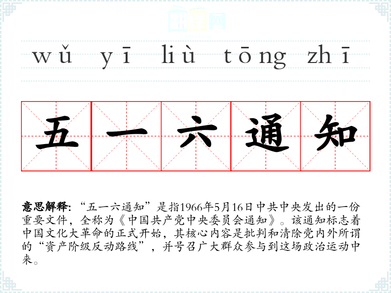 “五一六通知”是指19*年5月1日中共中央发出的一份重要文件,全称为《共产党中央委员会通知》。该通知标志着文化大革命的正式开始,其核心内容是批判和清除党内外所谓的“资产阶级反动路线”,并号召广大群众参与到这场政治**中来。