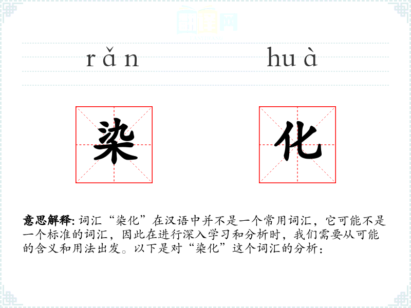 词汇“染化”在汉语中并不是一个常用词汇,它可能不是一个标准的词汇,因此在进行深入学*和分析时,我们需要从可能的含义和用法出发。以下是对“染化”这个词汇的分析: