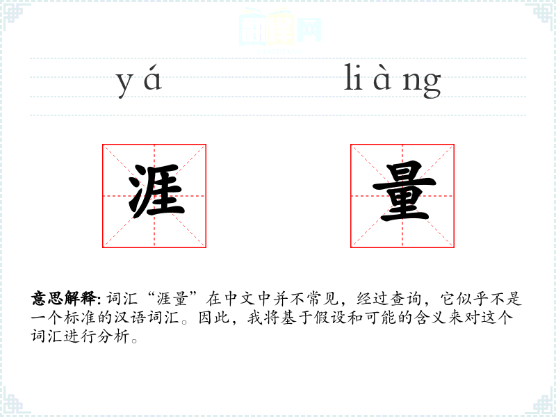 假设“涯量”是由“涯”和“量”两个字组合而成的词汇,我们可以推测其字面意思可能是“边界的测量”或“范围的限度”。在这里,“涯”通常指边界或尽头,而“量”则涉及测量或评估。