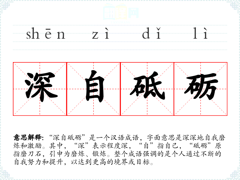 在英语中,类似的表达可能是“self-improvement”或“self-discipline”,虽然这些词汇没有直接对应“深自砥砺”的成语,但它们传达了类似的自我提升和努力的概念。