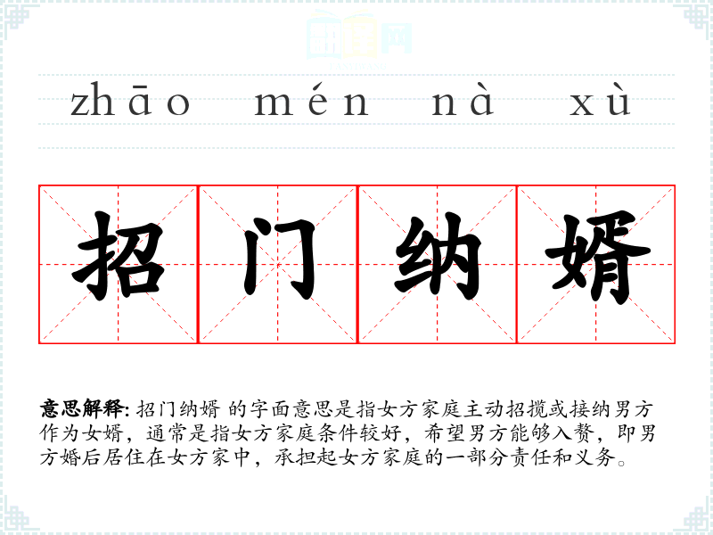 招门纳婿 的字面意思是指女方家庭主动招揽或接纳男方作为女婿,通常是指女方家庭条件较好,希望男方能够入赘,即男方婚后居住在女方家中,承担起女方家庭的一部分责任和义务。