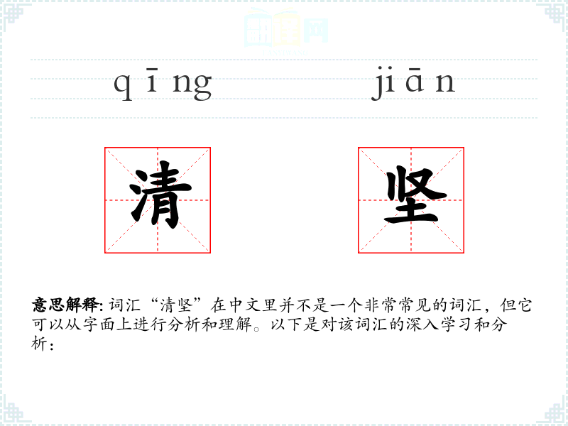 词汇“清坚”在中文里并不是一个非常常见的词汇,但它可以从字面上进行分析和理解。以下是对该词汇的深入学*和分析: