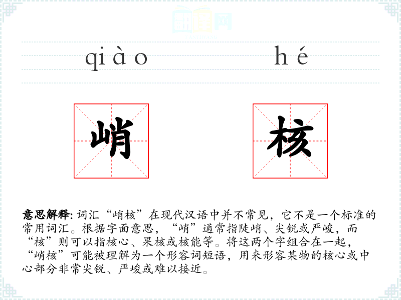 词汇“峭核”在现代汉语中并不常见,它不是一个标准的常用词汇。根据字面意思,“峭”通常指陡峭、尖锐或严峻,而“核”则可以指核心、果核或核能等。将这两个字组合在一起,“峭核”可能被理解为一个形容词短语,用来形容某物的核心或中心部分非常尖锐、严峻或难以接近。