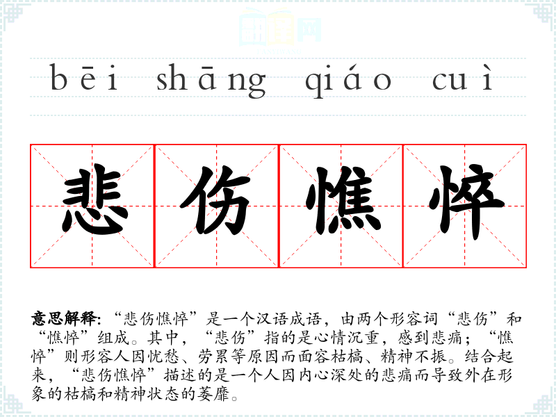 “悲伤憔悴”是一个汉语成语,由两个形容词“悲伤”和“憔悴”组成。其中,“悲伤”指的是心情沉重,感到悲痛;“憔悴”则形容人因忧愁、劳累等原因而面容枯槁、精神不振。结合起来,“悲伤憔悴”描述的是一个人因内心深处的悲痛而导致外在形象的枯槁和精神状态的萎靡。