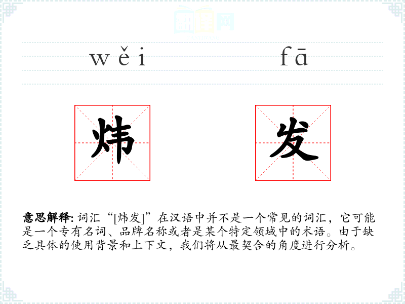 由于“炜发”不是一个标准词汇,我们无法给出确切的基本定义。它可能是由两个汉字组成的复合词,其中“炜”通常指光亮、光辉,而“发”可以指头发、发展、发出等含义。