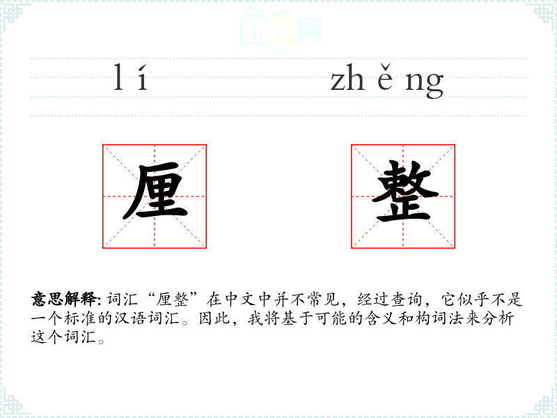 词汇“厘整”在中文中并不常见,经过查询,它似乎不是一个标准的汉语词汇。因此,我将基于可能的含义和构词法来分析这个词汇。