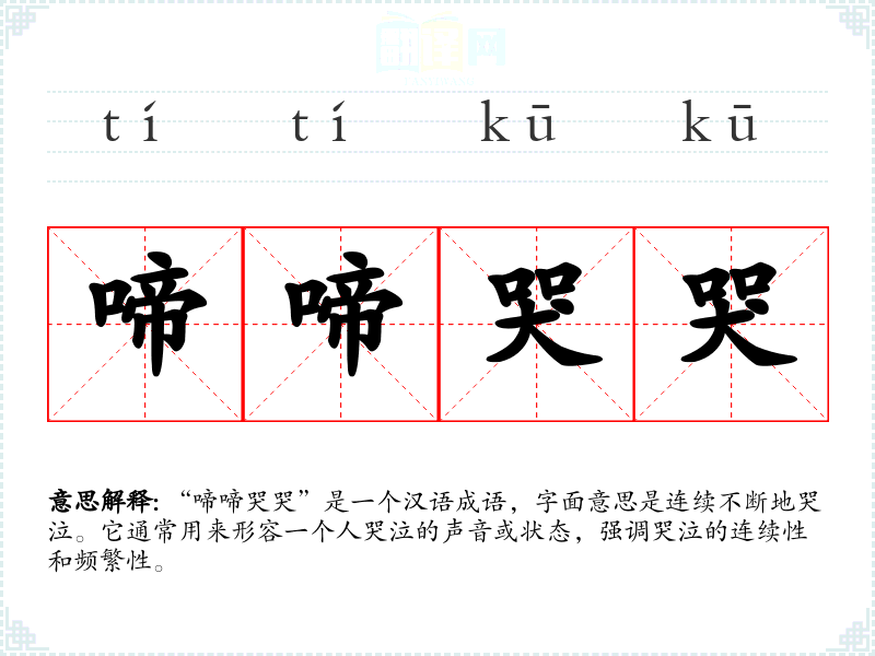 “啼啼哭哭”是一个汉语成语,字面意思是连续不断地哭泣。它通常用来形容一个人哭泣的声音或状态,强调哭泣的连续性和频繁性。