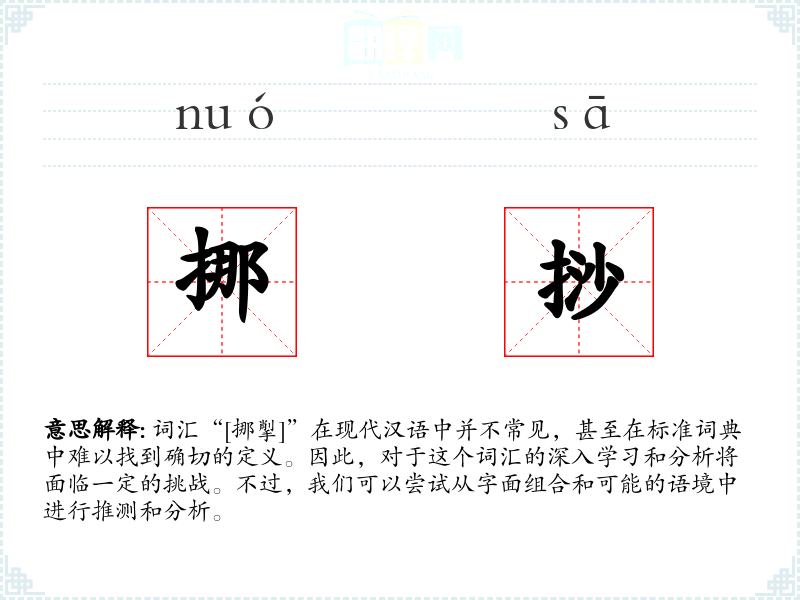 词汇“[挪揱]”在现代汉语中并不常见,甚至在标准词典中难以找到确切的定义。因此,对于这个词汇的深入学习和分析将面临一定的挑战。不过,我们可以尝试从字面组合和可能的语境中进行推测和分析。