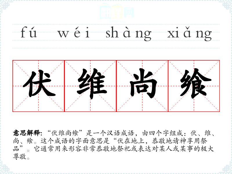 “伏维尚飨”是一个汉语成语,由四个字组成:伏、维、尚、飨。这个成语的字面意思是“伏在地上,恭敬地请神享用祭品”。它通常用来形容非常恭敬地祭祀或表达对某人或某事的极大尊敬。